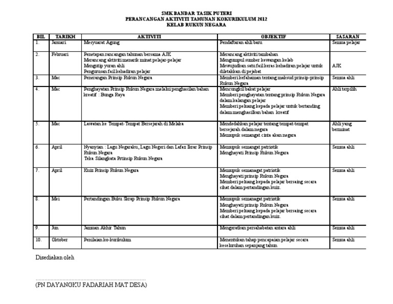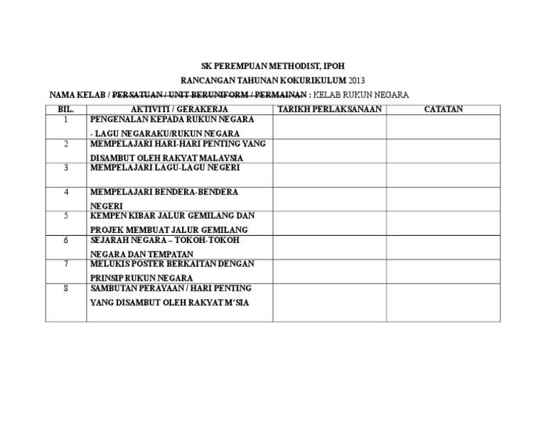Modul aktiviti kokurikulum kelab rukun negara krn smk muara tuang. Katanya setakat ini terdapat 6621 kelab rukun negara di sekolah rendah dan. Rancangan Aktiviti Tahunan Kelab Kebudayaan Pdf.